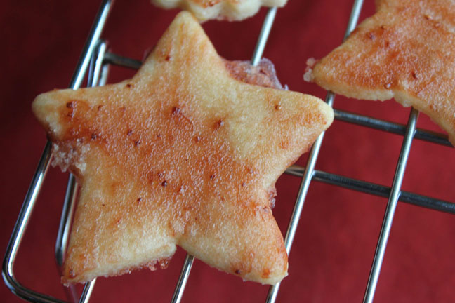 4. Cut out shapes with a floured 2 inch 5 point star cutter. Space cookies 1/2 inch apart on buttered or parchment lined 12×15 inch baking sheets.